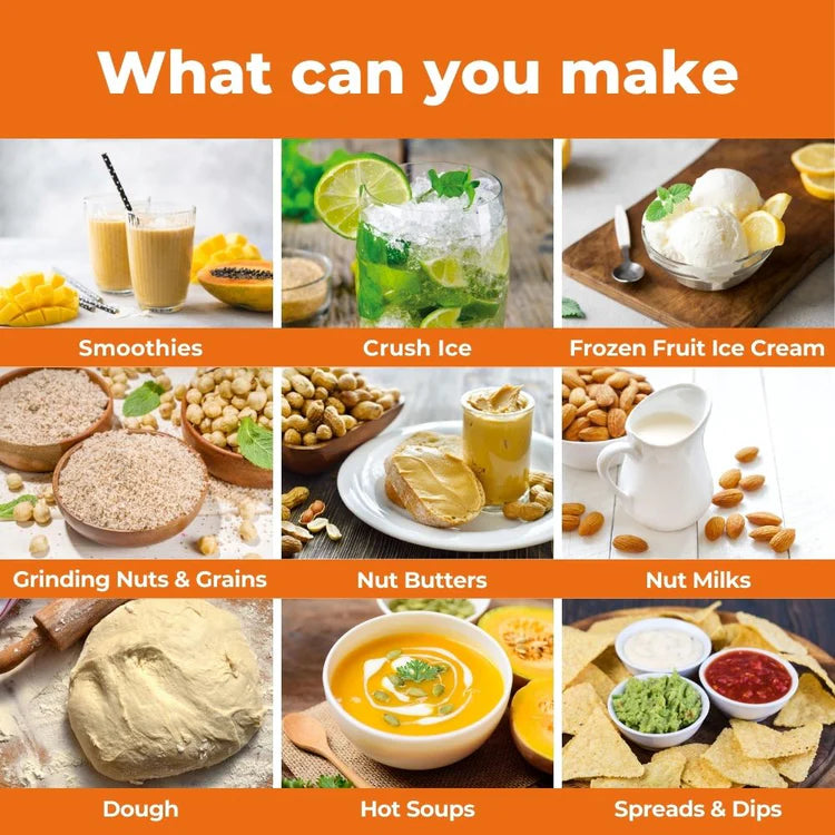 It can puree, chop, process, blend and heat food. The stainless steel blades can slice just about anything, from almonds to cheese. Make whipped cream, almond butter and even ice cream ice cream with the ultimate kitchen appliance that makes food preparation easy.